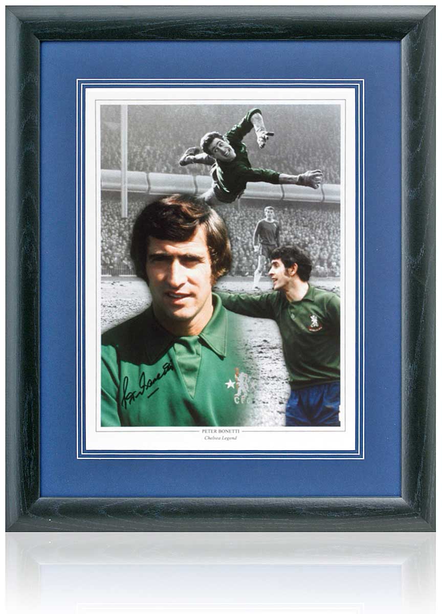 Fantastic 16x12" montage hand signed by Chelsea goalkeeping legend, Peter Bonetti.