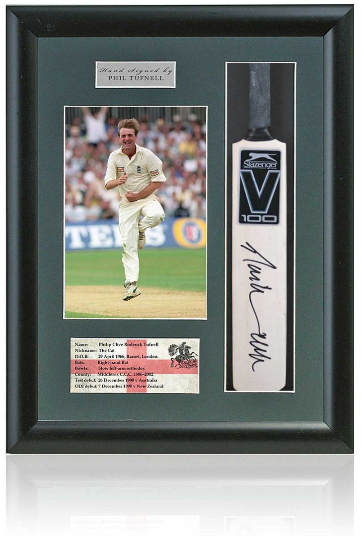 A truly superb framed presentation of England and Middlesex cricketing Legend Phil Tufnell which features a hand-signed mini bat mounted with an inset photograph of Tuffers, Silver Name Plague, and info sheet.