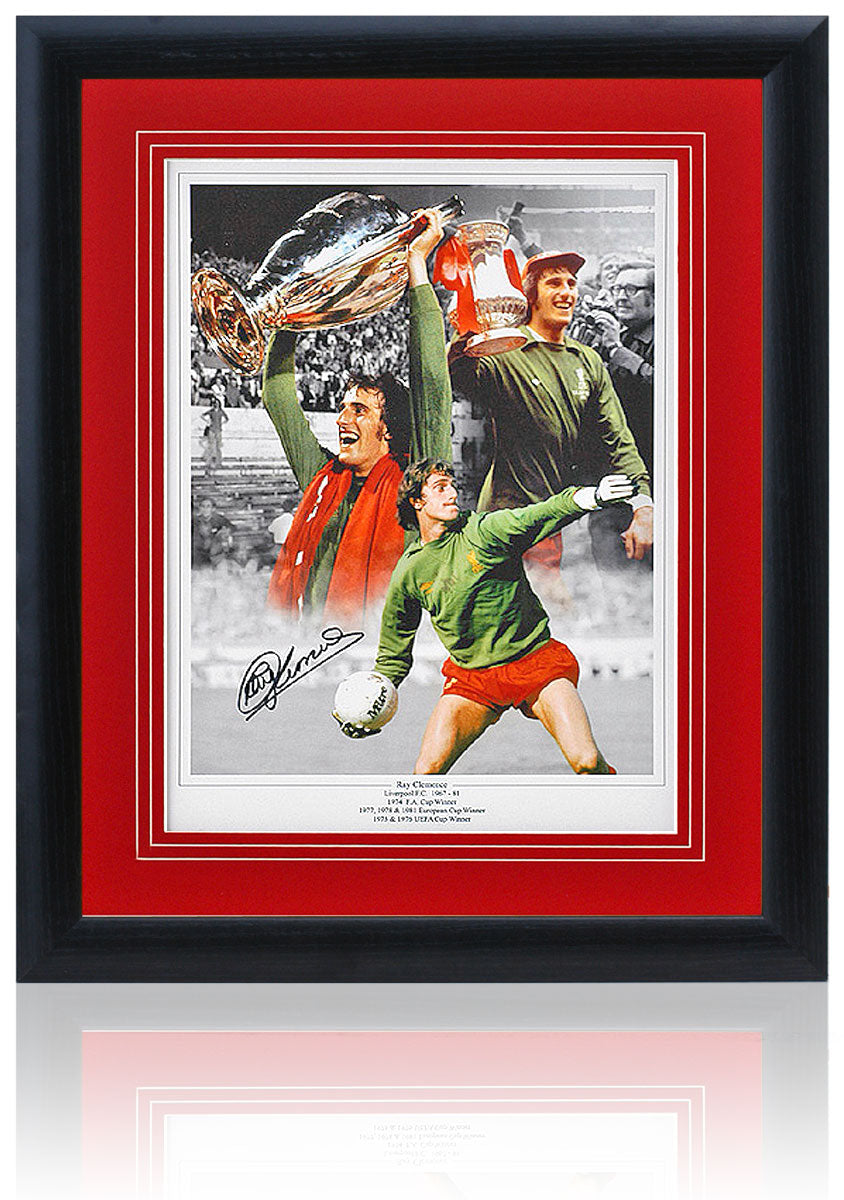 A fantastic 16x12” photographic montage hand-signed by Liverpool legend Ray Clemence, one of England’s greatest goalkeepers, winner of 5 First Division titles, 3 European Cups, 2 UEFA Cups, and 3 FA Cups during his illustrious career.