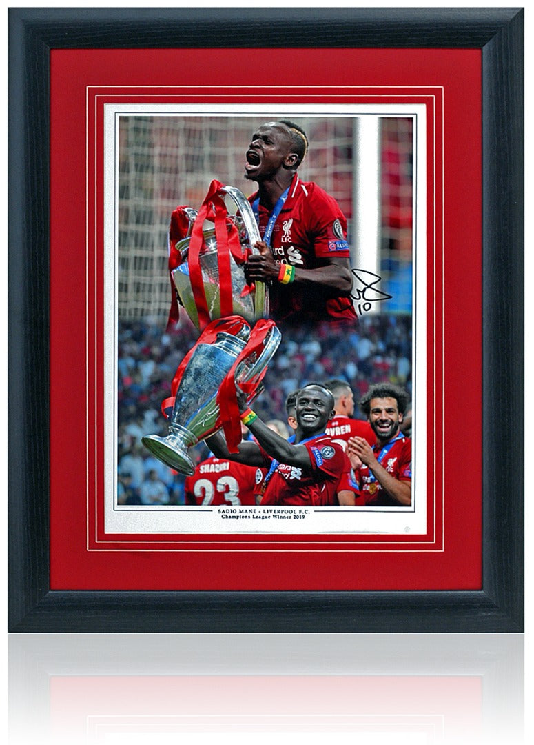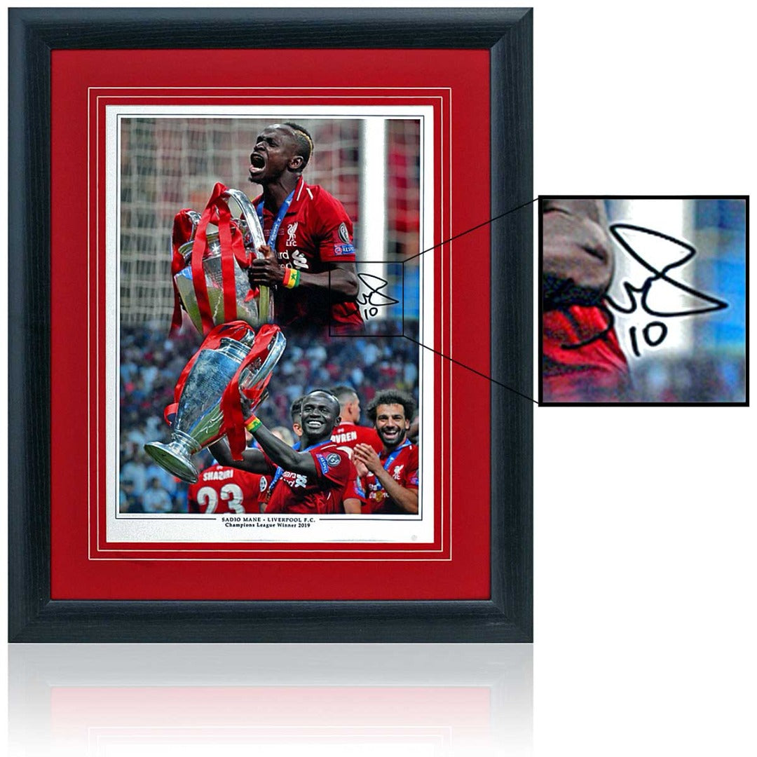 Fantastic 16x12" montage hand signed by Liverpool legend, Sadio Mane, pictured lifting the 2019 European Cup!!