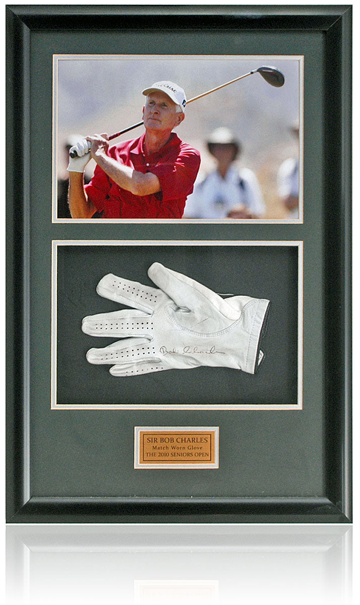 A fantastic rare piece of sporting memorabilia, this golf glove has been worn by Sir Bob Charles during the 2010 Seniors Open and has been hand-signed by the New Zealand golfing legend.