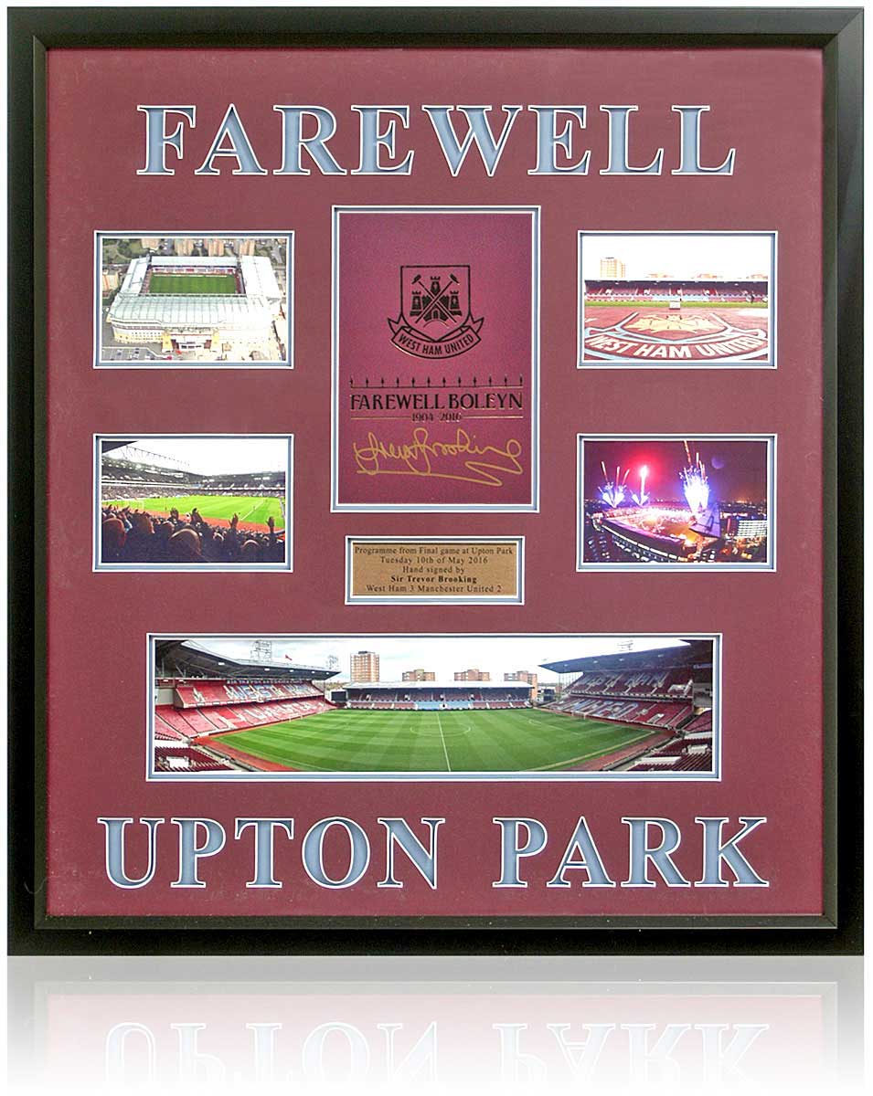 This fantastic piece comes surrounded by beautiful pictures of the ground with a brass plaque giving details of the emotional day. Comes double recess mounted in claret and blue artboard in a black frame measuring 70x75cm with a Certificate of Authenticity issued by AFTAL members The British Sports Museum with photo-proof of Brooking signing the piece.