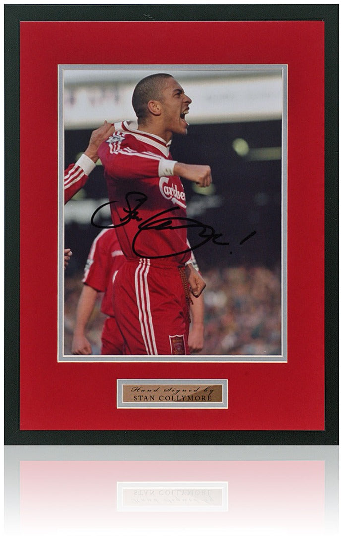 Fantastic 12x8" hand signed photograph of former Liverpool star, Stan Collymore. This fantastic piece comes double mounted on red and silver artboard in a black wood frame.