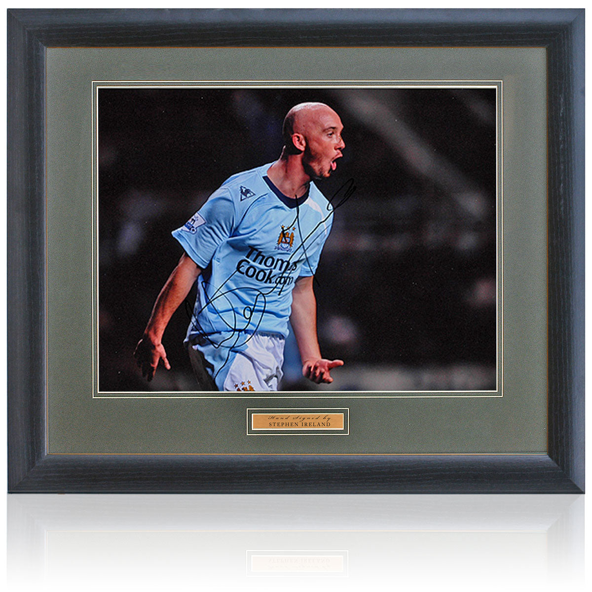 Fantastic 16x12" photograph hand signed by Stephen Ireland, a true Manchester City cult hero. This impressive piece of sporting memorabilia is professionally mounted in grey double v-groove mount board and presented in a black wood gallery frame measuring 23x19 inches, creating a striking, display-ready finish suitable for any home, office, or collection.