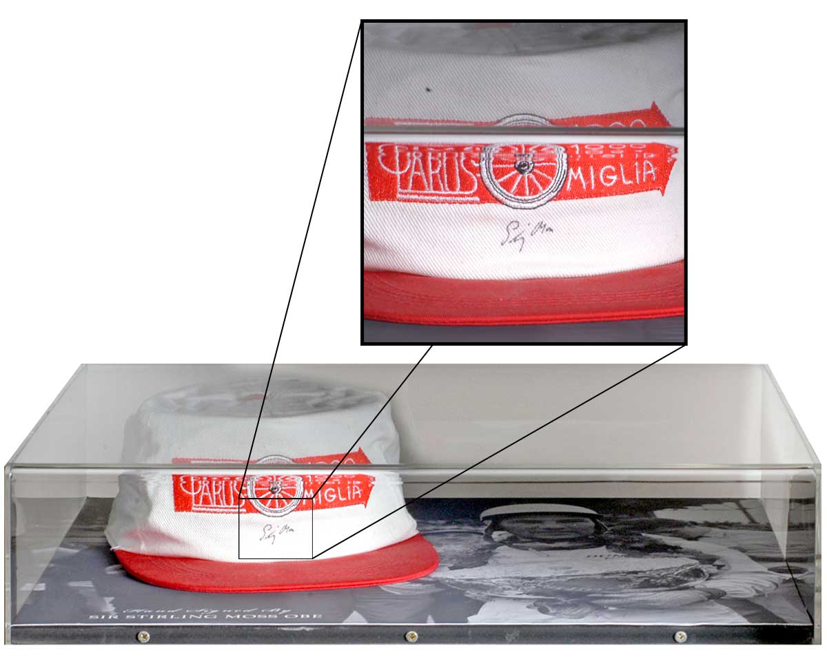Stirling Moss Hand Signed Ferrari Formula 1 Baseball Cap Display
