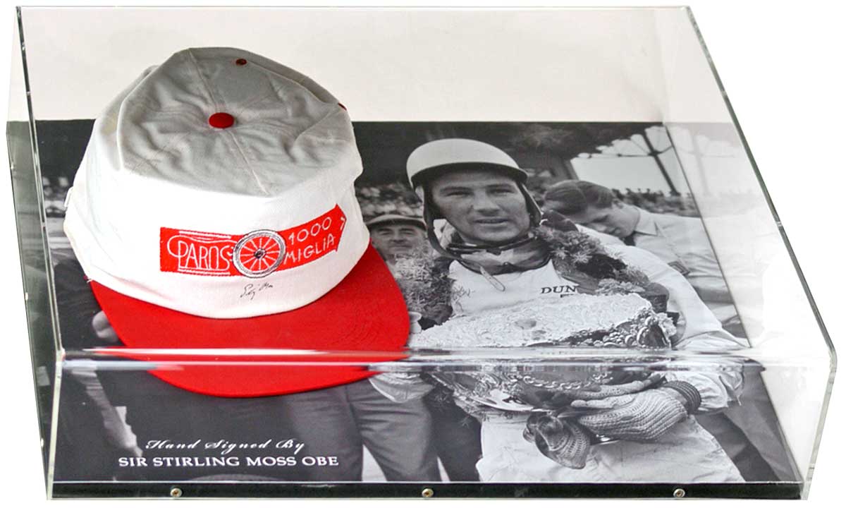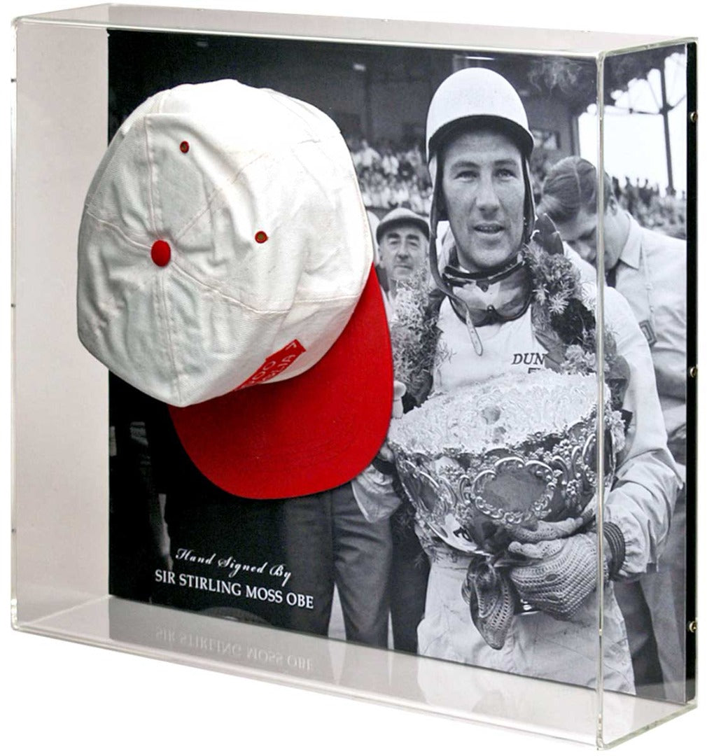 A truly superb acrylic presentation of Formula 1 racing legend Sir Stirling Moss, which features a hand-signed baseball cap in front of a fantastic photograph.