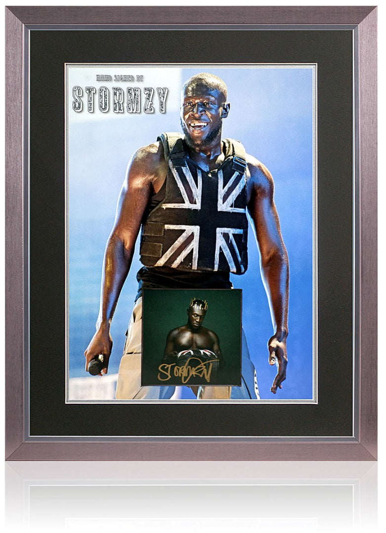 A stunning presentation of British grime artist, Stormzy which includes a hand-signed CD 'Heavy Is The Head' album cover in front of a fantastic picture of his iconic Glastonbury set.