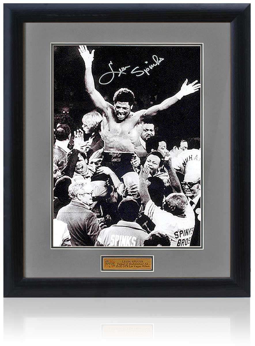Fantastic 16x12" photograph hand signed by boxing legend, Leon Spinks, pictured celebrating the moment he rocked the boxing world with his points decision win over Muhammed Ali in Las Vegas.