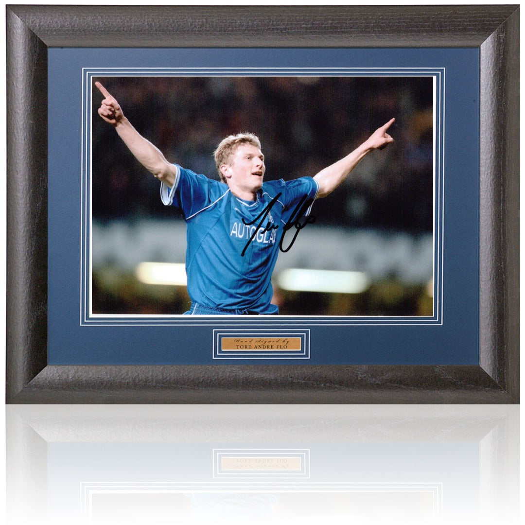 Fantastic 12x8" photograph hand signed by former Chelsea Norwegian legend, Tore André Flo. This amazing piece comes mounted in a blue artboard in a black wood frame. The item with a certificate of authenticity issued by AFTAL members The British Sports Museum.