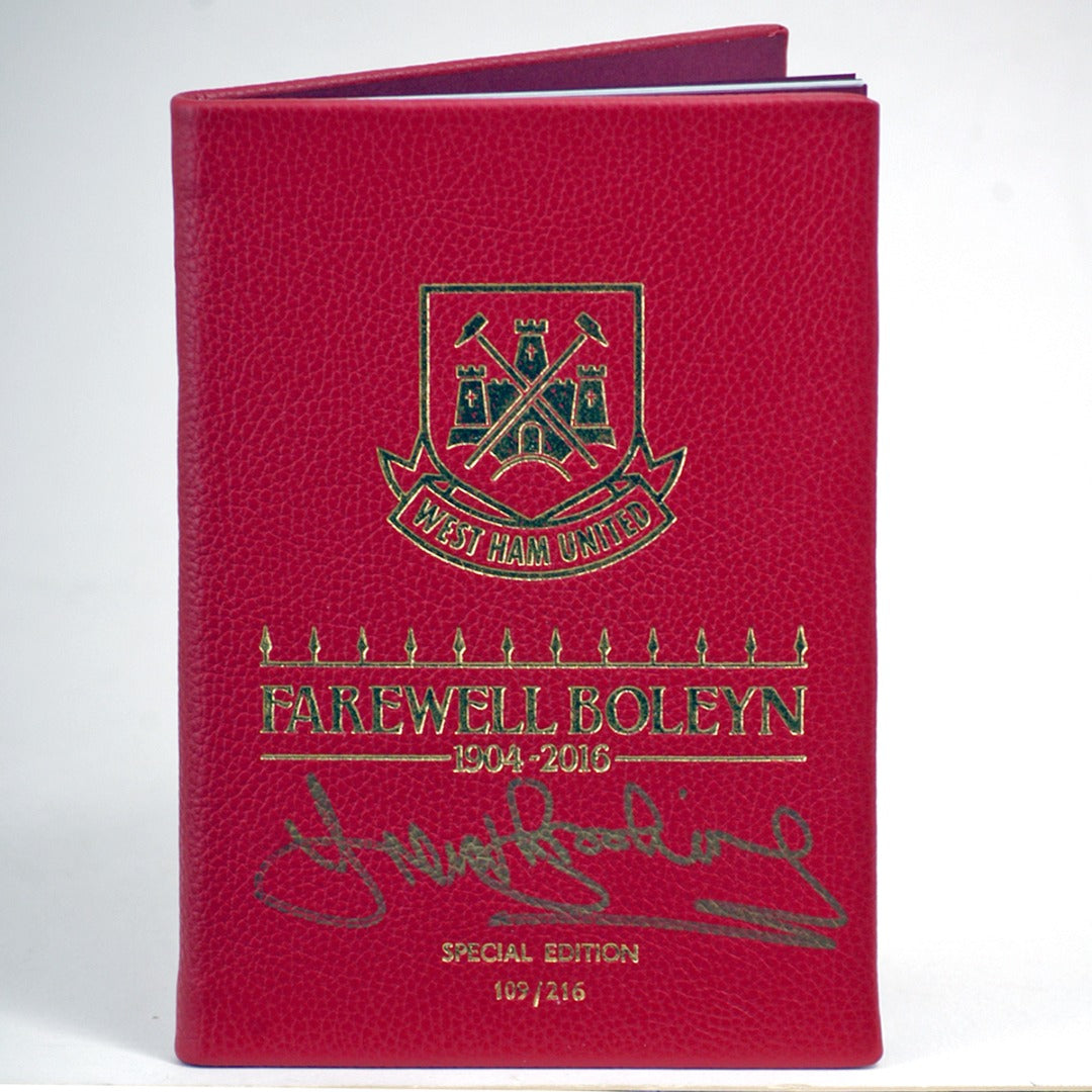 Rare leather-bound Farewell Boleyn special edition numbered match day programme from the last ever game at West Ham's famous Boleyn Ground at Upton Park Vs Manchester United 10.5.2016 hand-signed by club legend Trevor Brooking.
