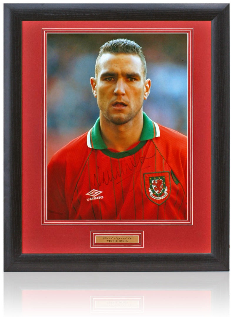 Fantastic hand signed photograph of Welsh football hardman, Vinnie Jones. The Print has been single mounted in a red artboard and framed in 23x19'' black wood frame. Item comes with a Certificate Of Authenticity issued by BritishSportsMuseum.com.