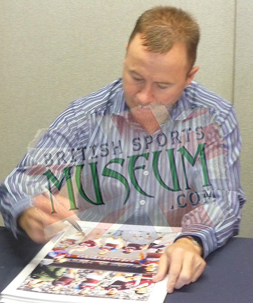This amazing piece comes double recess mounted in blue and claret artboard in a pewter gallery frame measuring 23x19 inches. The item comes with a photo-proof certificate of authenticity issued by AFTAL members The British Sports Museum.