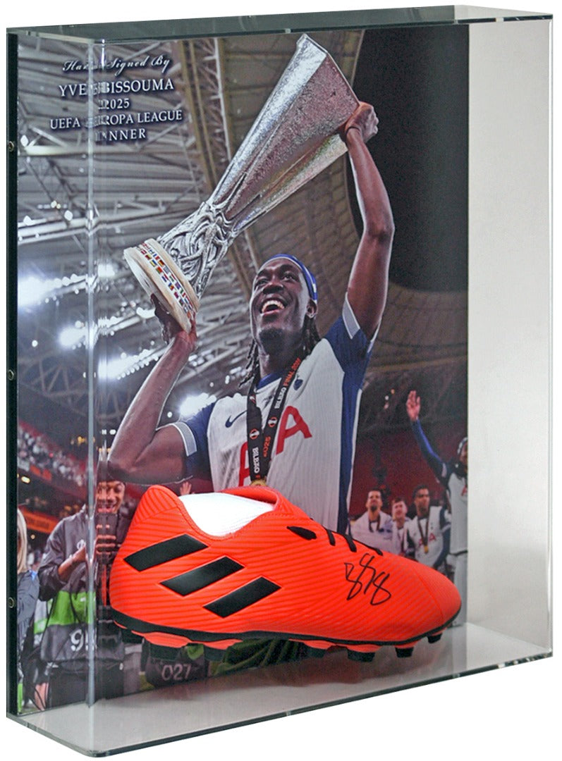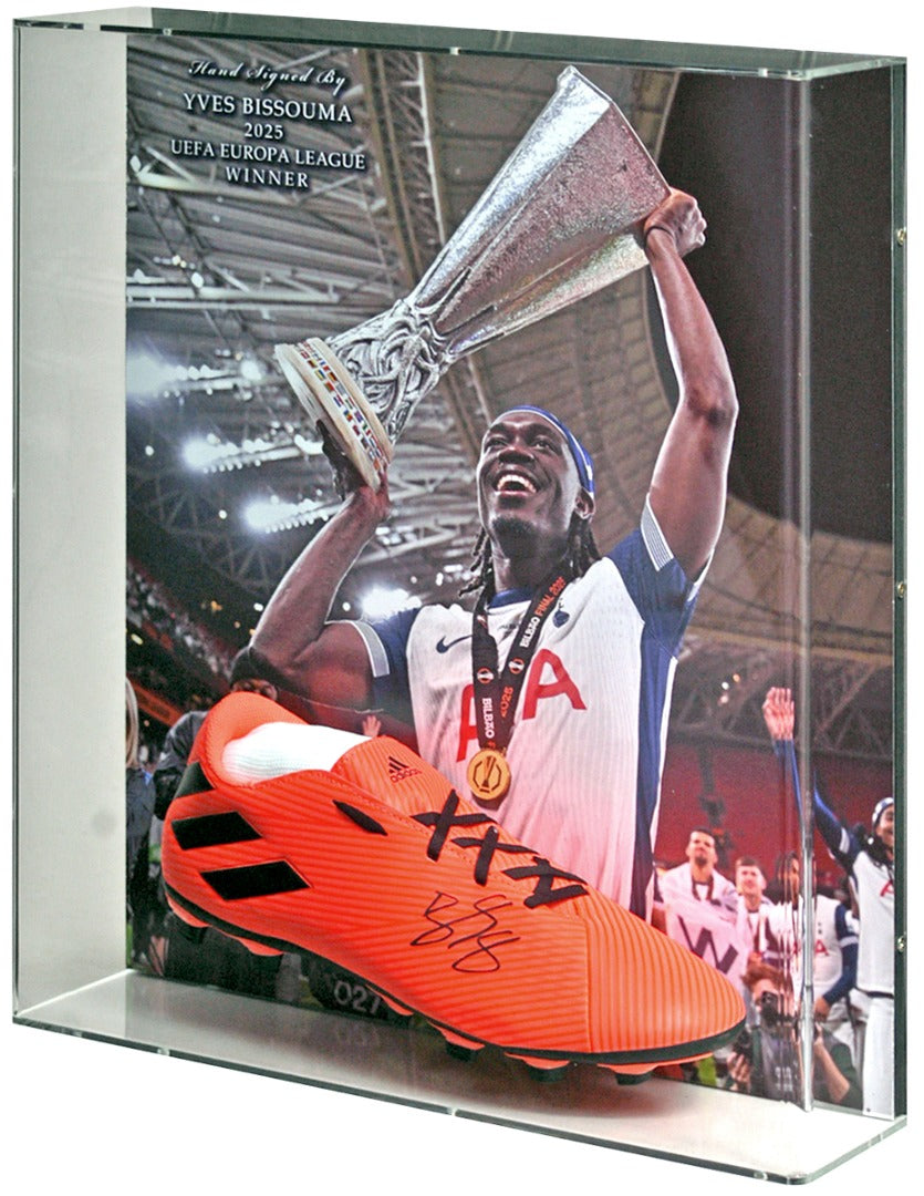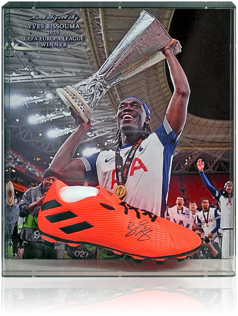A truly superb presentation of a football boot hand signed by Tottenham Hotspur 2025 Europa League Winner, Yves Bissouma.